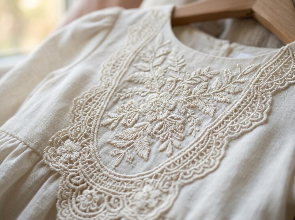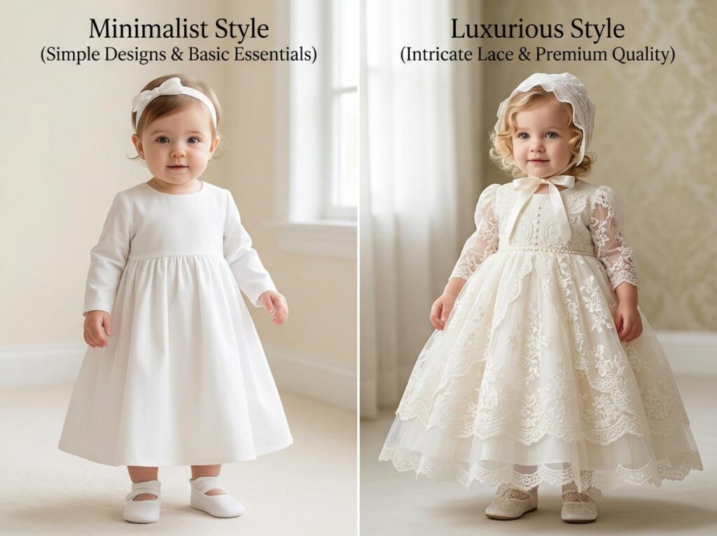 Delicate lace, embroidery, and textured fabrics are key indicators of premium baptism clothing.
