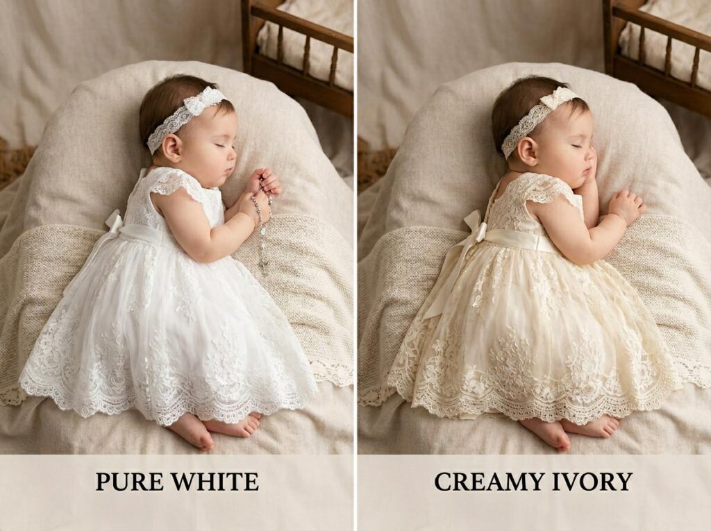 Babies typically wear white or ivory gowns made from soft, breathable fabrics such as cotton, satin, or lace.